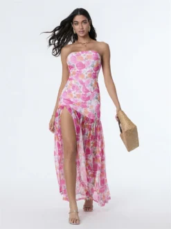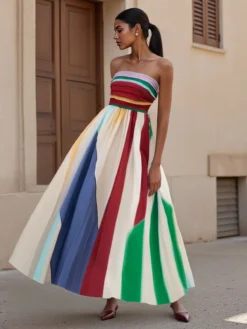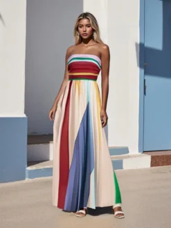 Women Strapless Dress Colorful Printed Ruffle Long Pleated Dress Summer Bohemian Holiday Clothes