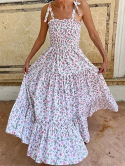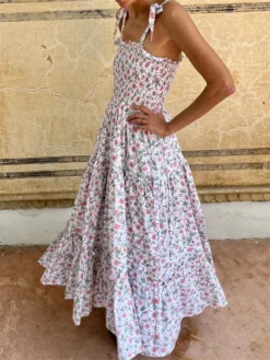 Women Sleeveless Dress Casual Summer Floral Print Tie up Strap A-Line Party Dress for Vacation Beach Streetwear