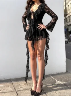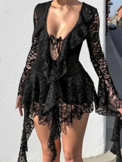 Women Lace Mini Dress Flared Long Sleeve V Neck Irregular Ruffle A-line Mini Dress Summer Fall Sexy Elegant Sundress