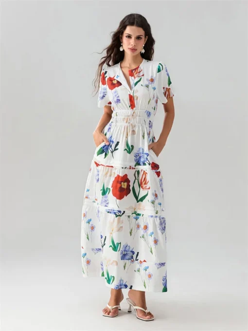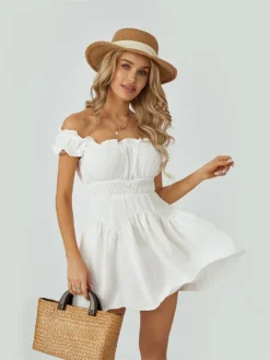 Women Summer White Dress Puff Short Sleeve Off Shoulder Ruffle Layered Dress Bohemian Y2K Aesthetic Dresses Female
